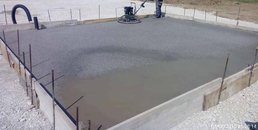 Einer der fleißigen Arbeiter, der soeben die Bodenplatte mit einem Flügelglätter bearbeitet um eine schöne glatte Oberfläche zu erreichen. Also hart und Glatt! Top :)
